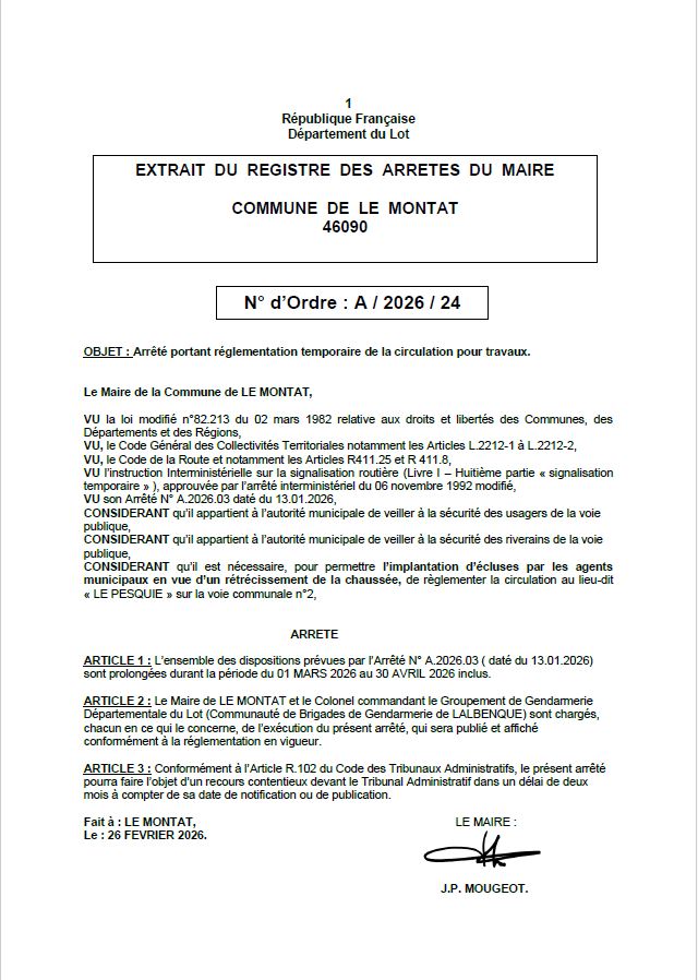 Les travaux nécessaires à implantation d'écluses par les agents municipaux en vue d'un rétrécissement de la chaussée au lieu dit " le PESQUIE" sur la voir communale N° 2 sont PROLONGÉS DURANT LA PÉRIODE DU 1° MARS 2026 AU 30 AVRIL 2026 INCLUS;